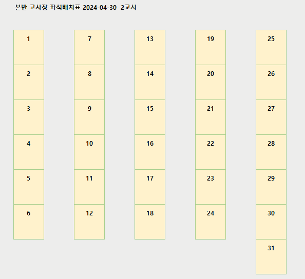[참고] 고사좌석배치 구조는 자유롭게 변경할 수 있습니다. 숫자(좌석번호)가 입력된 셀 바로 아래셀에 학생을 표시합니다.